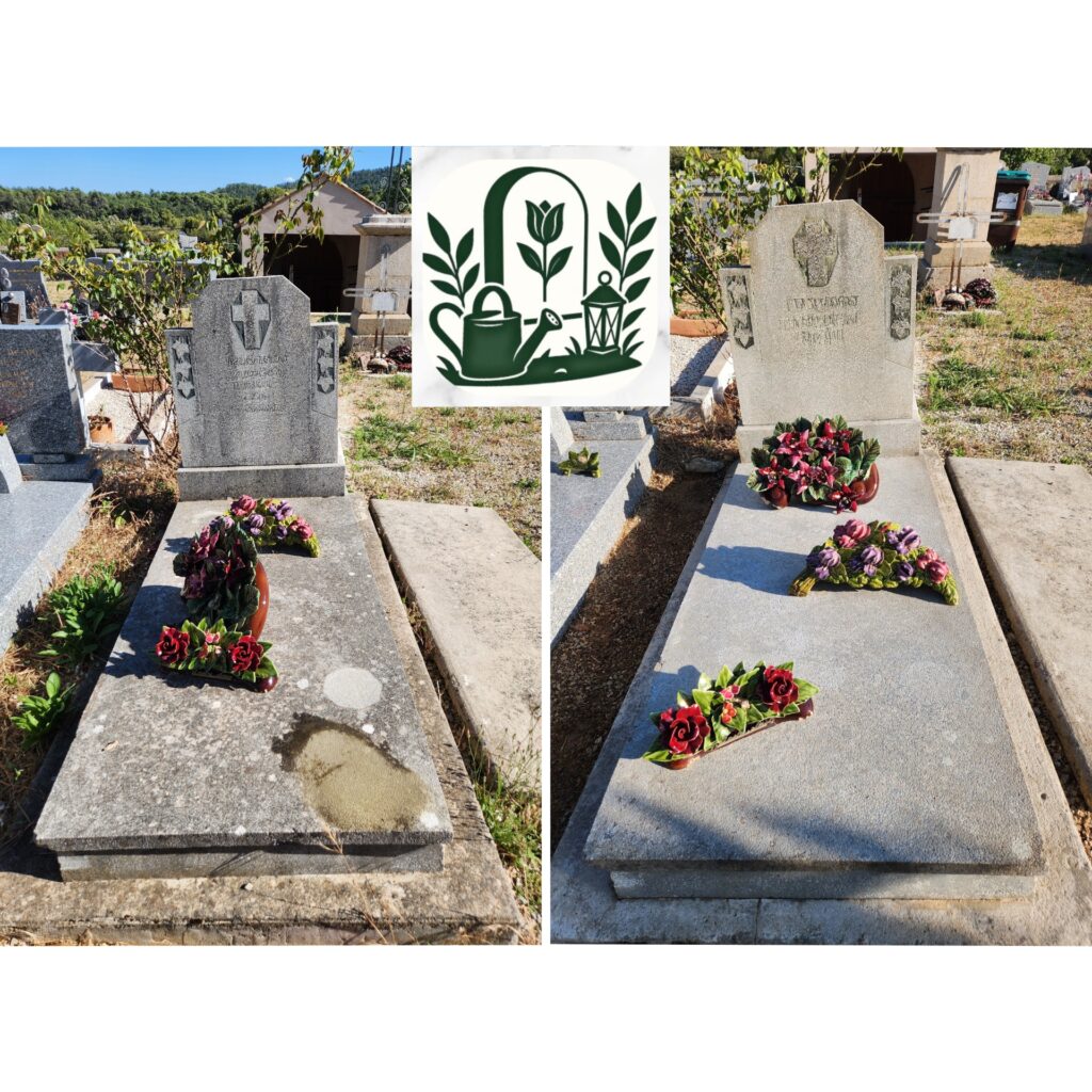 Nettoyage complet : Désherbage autour de la sépulture, enlèvement des fleurs/plantes fanées, dépoussiérage, brossage manuel de la sépulture avec produits écologiques, nettoyage des ornements, rinçage.